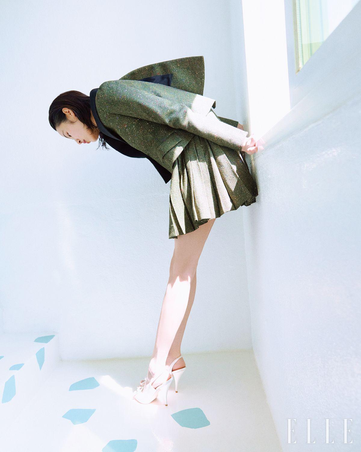 트위드 쇼트 재킷과 트위드 플리츠 미니스커트, 화이트 새틴 디올 보 슬링백 샌들은 모두 Dior.
