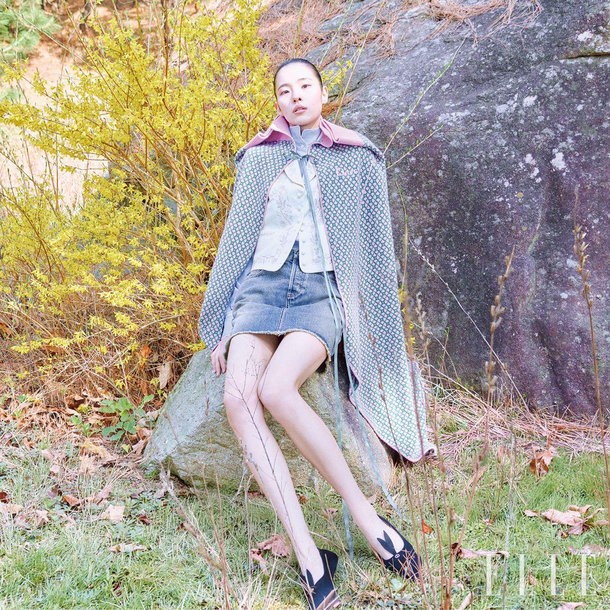 리본 칼라 디테일의 자카르 니트 케이프와 엠브로이더리 실크 베스트, 포플린 셔츠, 데님 미니스커트, 디올 위스퍼 펌프스는 모두 Dior.