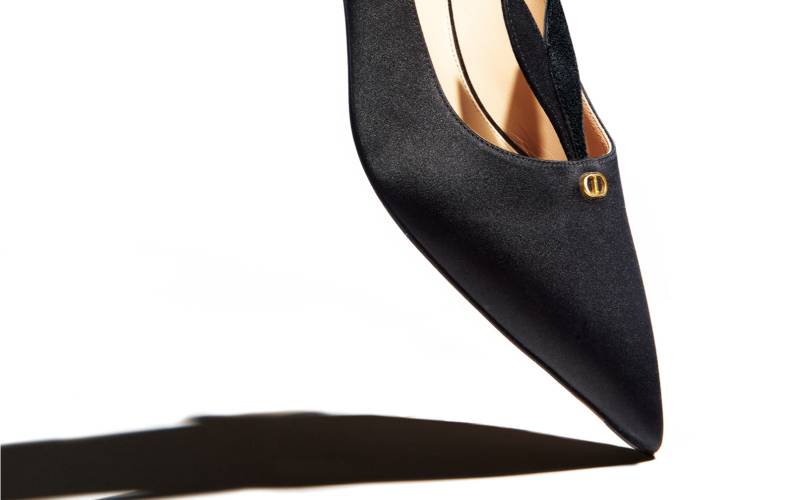 실크 인서트 스웨터와 시폰 롱스커트, 디올 보 슬링백 샌들, 블랙 카프스킨 디올 시갈(Dior Cigale) 백은 모두 Dior.