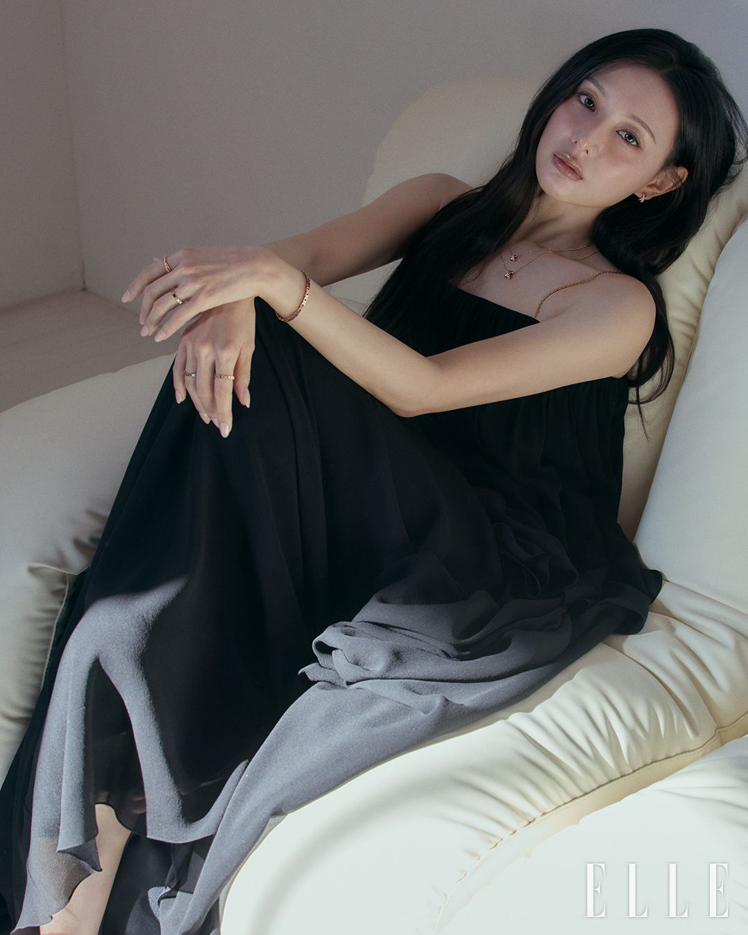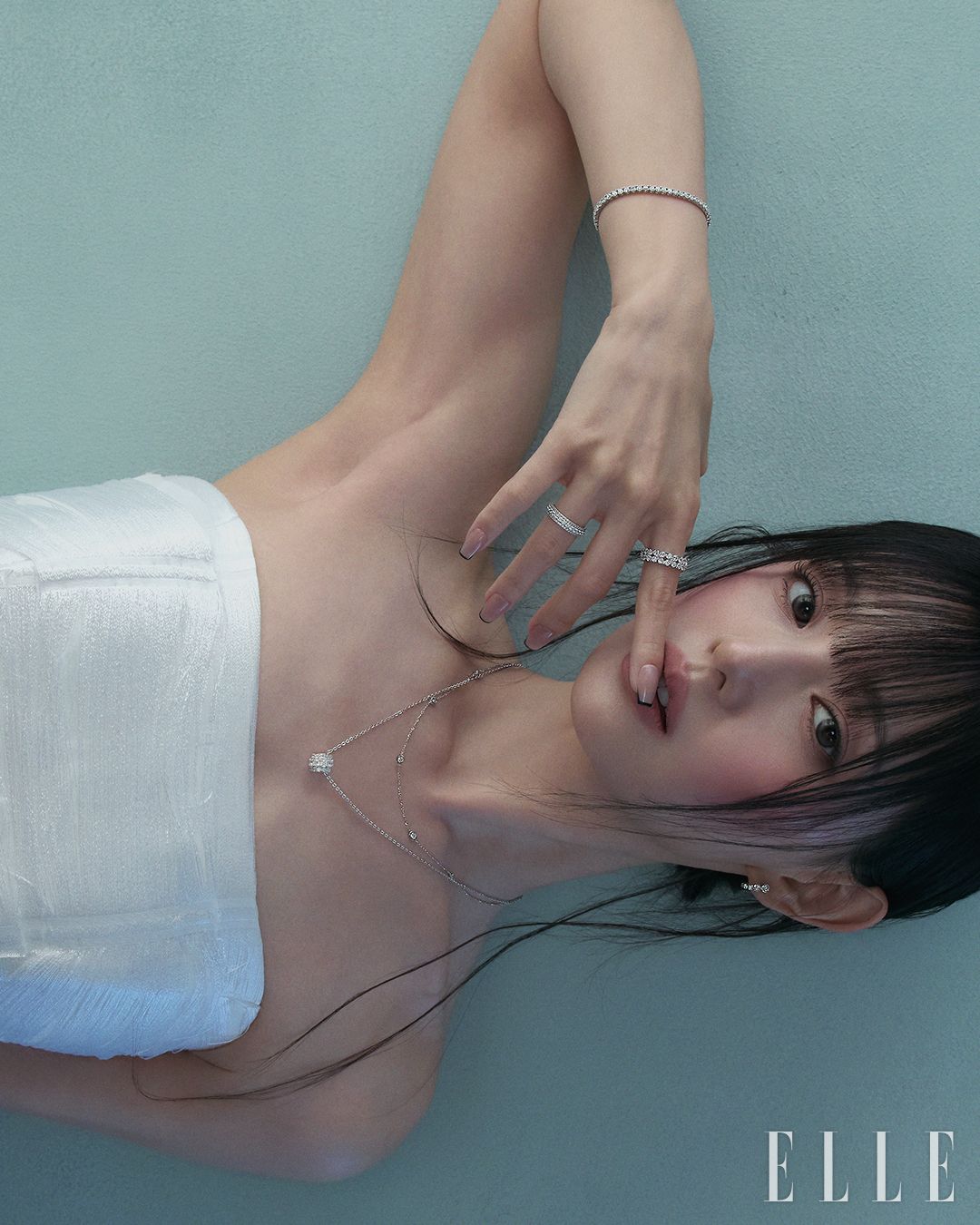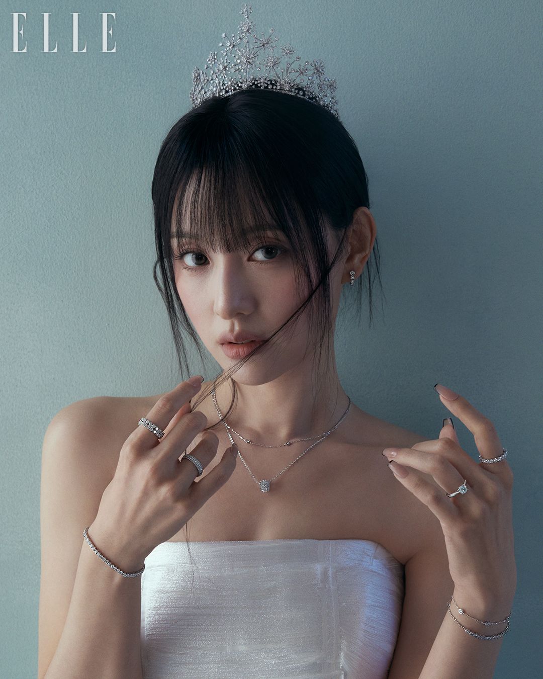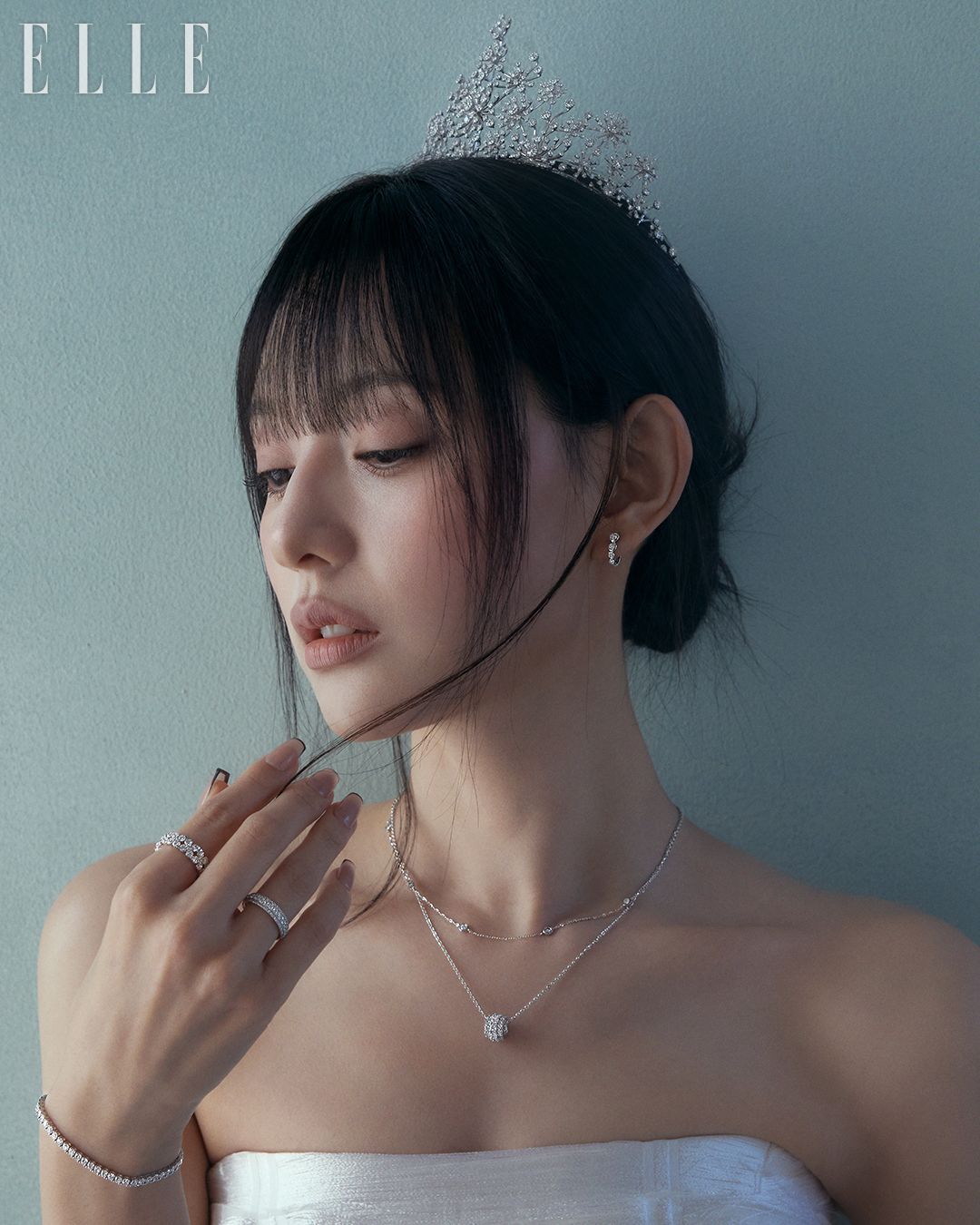 18K 화이트 골드 소재에25캐럿 천연 화이트 다이아몬드 600피스를 세팅한 티아라, 14K 화이트 골드 소재의 벨라 이어링과 벨라 네크리스, 벨라 펜던트, 오른손 검지와 약지에 착용한 14K 화이트 골드 소재의 벨라 링과 벨라 브레이슬릿, 왼손 검지에 착용한 14K 화이트 골드 소재의 벨라 링, 약지에 착용한 14K 화이트 골드 소재에 1캐럿 랩 다이아몬드를 세팅한 벨라 링, 14K 화이트 골드 소재의 벨라 브레이슬릿, 레이어드한 벨라 브레이슬릿은 모두 STONEHENgE.