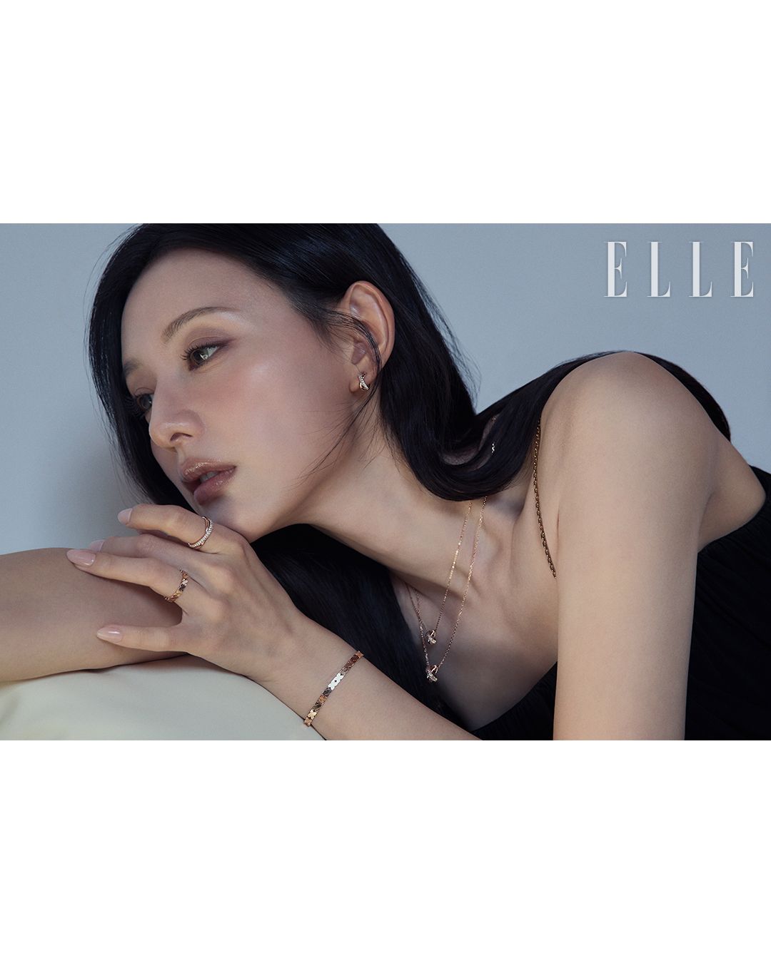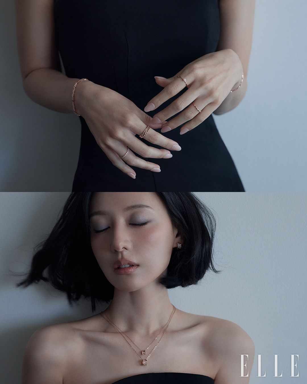 위) 오른팔에 착용한 14K 로즈 골드 소재의 엘리먼츠 브레이슬릿, 약지에 착용한 14K 로즈 골드 소재의 링, 검지에 착용한 14K 로즈 골드 소재의 엘리먼츠 링, 왼팔에 착용한 14K 로즈 골드 소재의 엘리먼츠 브레이슬릿, 검지와 약지에 착용한 14K 로즈 골드 소재의 엘리먼츠 링은 모두 STONEHENgE. (아래) 14K 로즈 골드 소재의 엘리먼츠 이어링과 엘리먼츠 네크리스, 레이어드한 엘리먼츠 네크리스는 모두 STONEHENgE.