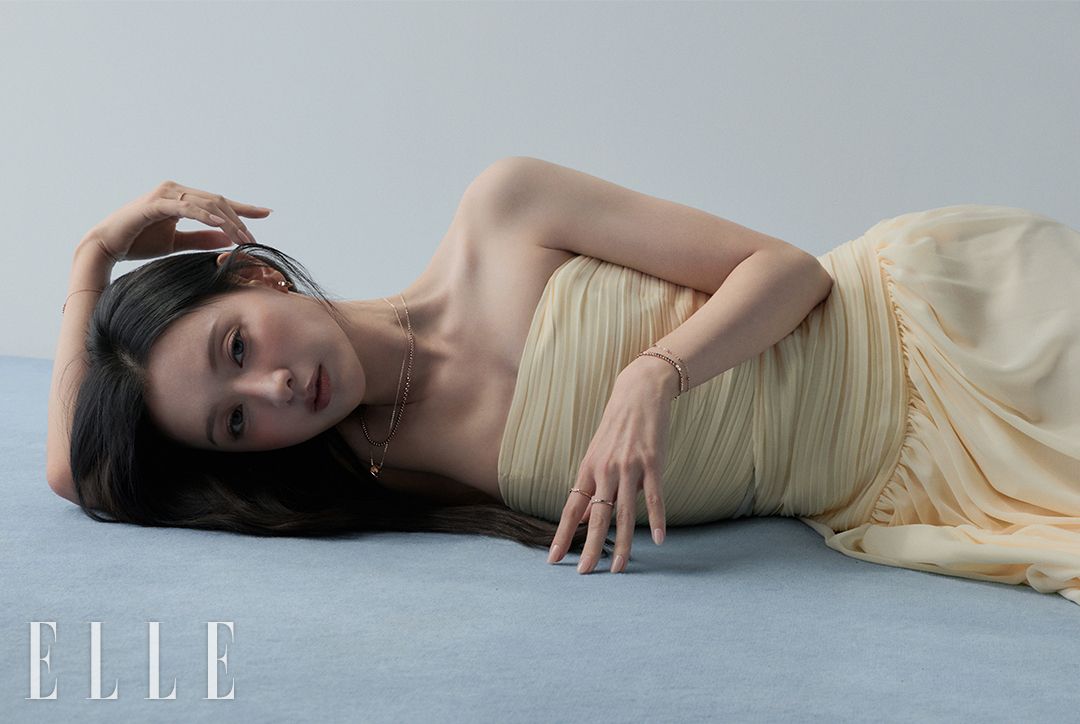 14K 로즈 골드 소재의 달빛 이어링과 달빛 네크리스, 달빛 펜던트, 오른손 검지에 착용한 14K 로즈 골드 소재의 달빛 링, 약지에 착용한 14K 로즈 골드 소재의 링, 왼팔에 착용한 14K 로즈 골드 소재의 달빛 브레이슬릿, 레이어드한 달빛 브레이슬릿, 검지에 착용한 14K 로즈 골드 소재의 달빛 링, 중지에 착용한 14K 로즈 골드 소재의 링은 모두 STONEHENgE.