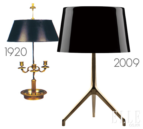 2009 `Lumiere XXL’ by Rodolfo Dordoni 포스카리니(Foscarini) 사를 위해 디자인한 로돌포 도르도니의 테이플 램프는 원래의 램프 디자인을 위아래로 바꾸어놓았다. 브론즈 스탠드는 다리가 세 개 달린 형태로 바뀌었고 크기는 XXL로 키워졌으며 갓에는 입으로 불어 만든 유리가 사용됐다. 간단히 말해 미니멀한 조각 같은 오브제로 재창조했다.