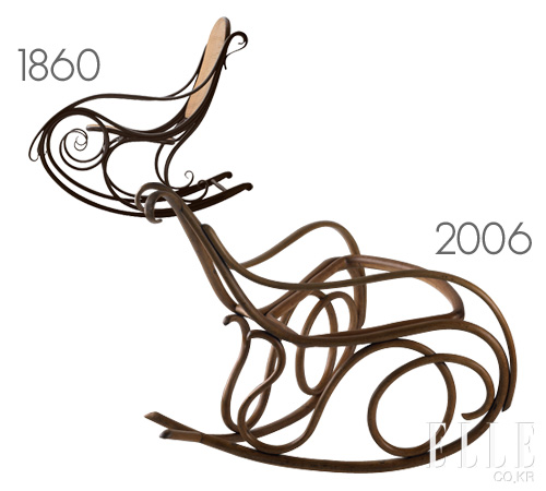 1860 Rocking-Chair 오스트리아의 유명한 가구 업체 토네(Tonet)가 세계 최초로 나무를 둥글게 구부려서 만든 흔들의자가 바로 ‘Schaukel-Fauteuil n<25EF> 1’이다. 나무를 유연하게 구부리는 이 혁신적인 기술의 비결은? 나무를 수증기로 가열한 다음 곧바로 원하는 모양으로 구부려 접는 것이다. 이 장신 정신이 돋보이는 걸작은 오늘날 디자인의 세계적인 표준이 됐다.