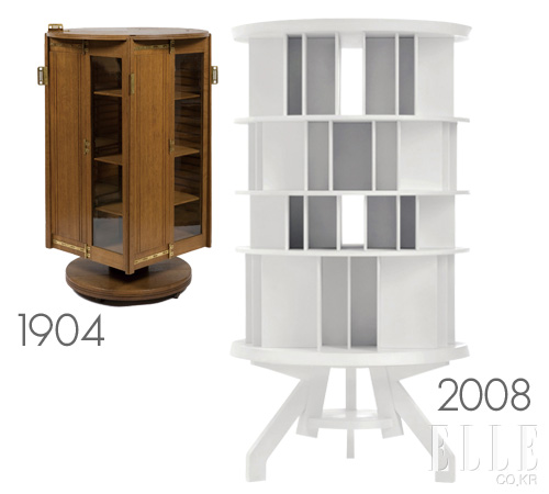 1904 Rotating Bookshelf 회전하고 이동하는 책꽂이. 이 책꽂이는 18세기에 새롭게 생겨난 실용 가구에 대한 개념을 훌륭하게 구현한 제품이다. 19세기부터 20세기까지 구스타브 세뤼리에-보비, 프란시스 주르댕, 그리고 르네 가브리엘(40년대에 가구를 대중에게 전파시킨 디자이너)은 책장을 대중화시키려 했다. 그렇지만 여전히 부르주아의 면모를 갖게 된다.
