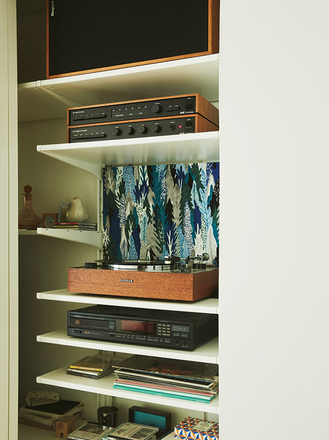 거실 한편에 수납장을 짜고 슬라이딩 도어를 달아 여러 물건들을 수납했다. 김희선 대표가 즐겨 읽는 책들, 오디오 마니아인 남편이 아끼는 오디오 시스템이 보인다.