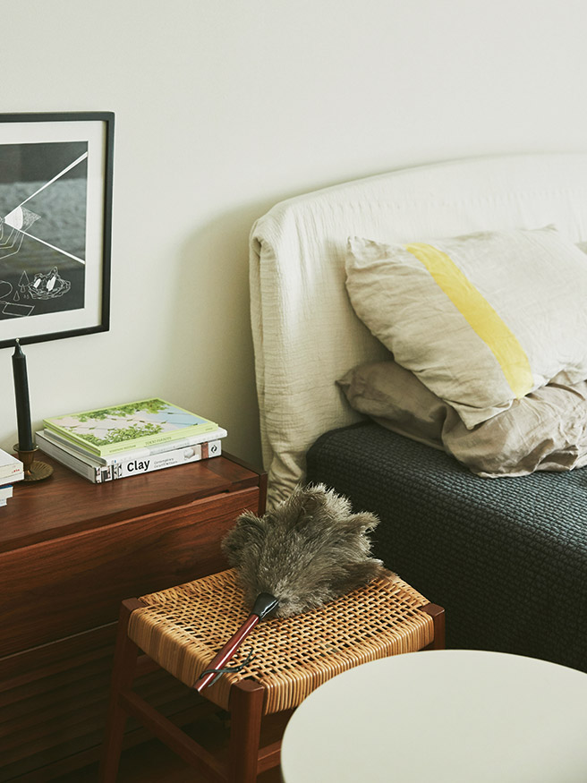 자연스러운 촉감의 리넨 침구가 깔린 침대 옆에는 김대현 작가의 작품이 걸려 있다. 가구 역시 모두 그녀의 남편이 만들었다.