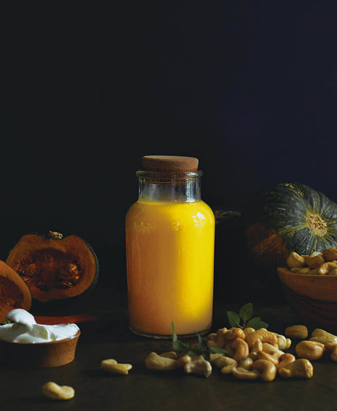 2 찐 단호박과 견과류, 그릭 요거트 그리고 꿀을 믹서에 넣고 갈아서 스무디를 만든다.