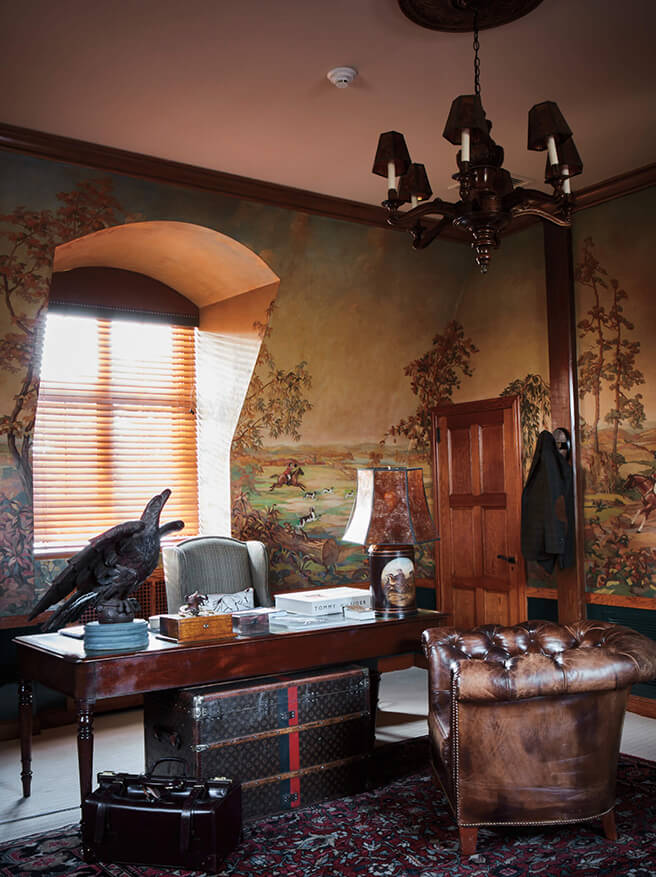 탑 3층에 자리한 타미 힐피거 작업실 벽에는 이 집이 처음 건축될 당시에 그려진 광활한 사냥터가 벽화로 재현돼 있다. 가죽 의자는 에드워디언 시대에 풍향계로 제작된 청동 독수리 조각은 18세기에, 루이 비통 트렁크는 1840년에 제작된 제품으로 엄청난 문화유산들이 자리 잡고 있다.