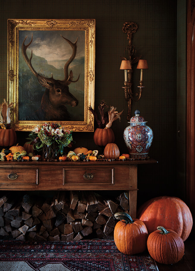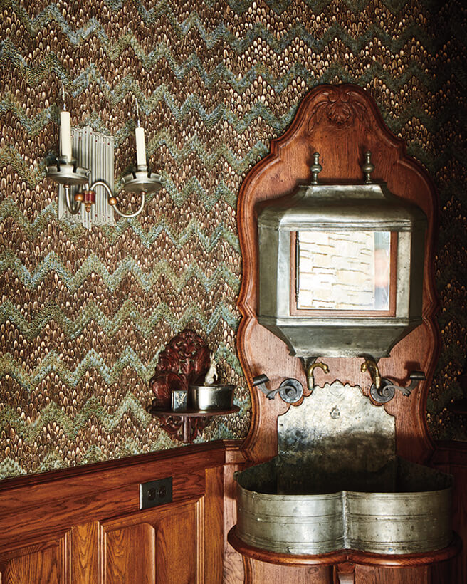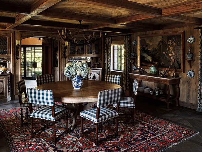 장식 화가인 크리스천슨 리 스튜디오(Christianson Lee Studios)의 넬 크리스천슨(Nels Christianson)이 인조 목재 패널로 완성한 아침 식사 공간. 사슴뿔 샹들리에 아래로 떡갈나무 테이블과 리넨 소재의 체크 패턴 의자가 놓여 있다. 벽에는 17세기 네덜란드 정물화가, 19세기 프랑스산 콘솔 위에는 18세기 델프트(Delft) 자기를 놓았다. 시선을 끄는 러그는 윈저 공작 부부가 사용하던 것이다.