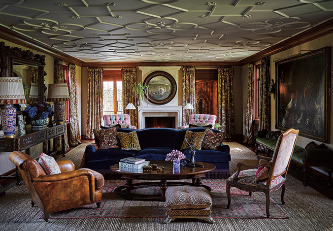 하이드 파크 몰딩(Hyde Park Mouldings, Inc)에서 시공한 천장, 수공예 스텐실 벽과 신할라 리넨(Sinhala Linen)의 조화가 눈길을 끄는 거실의 컬러들은 타미 힐피거의 미국적인 뿌리를 미묘하게 암시하고 있다. 실크 벨벳으로 덮인 조지 스미스(George Smith) 소파 위엔 앤티크 태피스트리와 스칼라만드레(Scalamandre)의 레오퍼드 프린트 쿠션이 놓여 있다. 벽난로 앞에 놓인 터키풍의 스트라이프 암체어는 로버트 카임(Robert Kime) 제품. 19세기 헤리즈 러그가 청키한 러그 위에 레이어드돼 있다.
