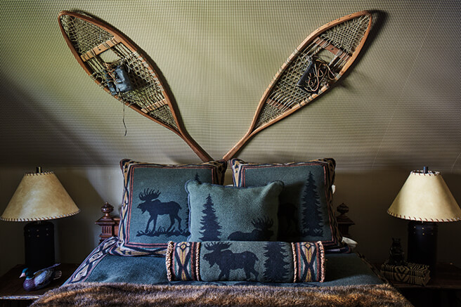 윌리엄 4세의 마호가니(William IV Mahogany) 침대와 스코틀랜드 성의 침실에서 영감을 얻은 울을 사용해 꾸민 부부의 침실과는 달리, 아스펜(Aspen) 침구와 앤티크 스키 장비를 활용해 편안하게 꾸민 게스트 하우스의 침실.