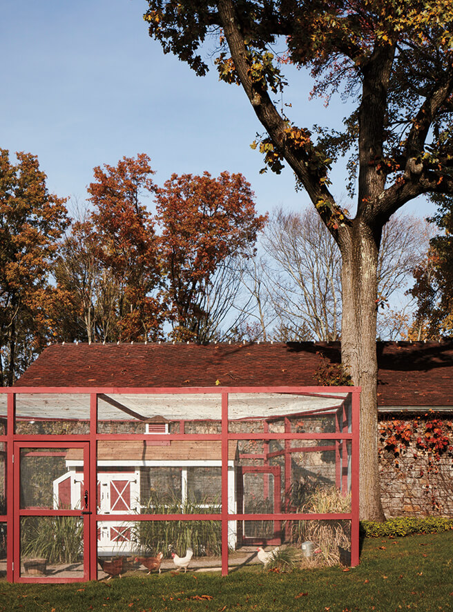 정원을 거니는 닭들은 수지 힐피거(Susie Hilfiger)의 집들이 선물이다. 닭장에는 ‘Tommy Red’라고 쓰여 있다.