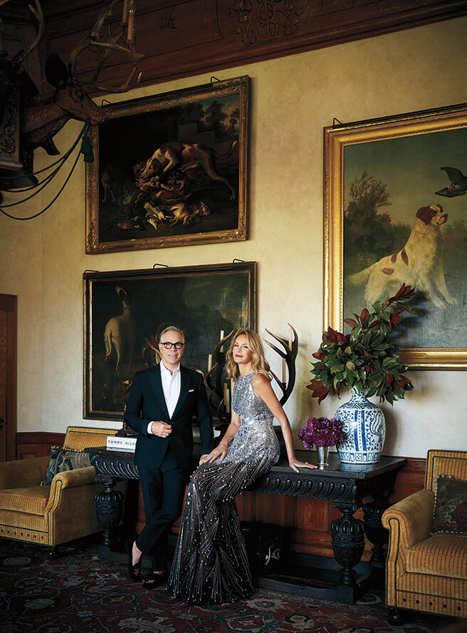 18-19세기의 사냥개 그림들을 배경으로 선 타미 & 디 힐피거. 그들 뒤로 17세기 초에 제작된 수사슴 뿔 촛대와 중국 청나라 시대의 자기가 놓여 있다.