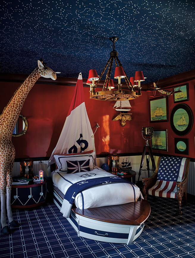 힐피거 집안의 가장 어린 멤버 세바스천의 방엔 포터리 반 키즈(Pottery Barn Kids)의 선장 침대가 놓여 있다. 천장에는 별이 총총한 랄프 로렌 홈(Ralph Lauren Home) 벽지 위에 설치된 ‘키’ 샹들리에가 평화로운 밤을 항해하게 만든다. 런던 해로즈 백화점에서 구입한 슈타이프의 기린은 세바스천을 지키는 수호천사 역할을 한다.