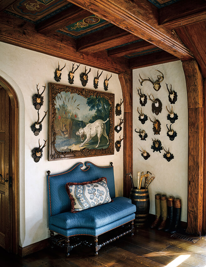이탈리아의 빈티지 디자인에서 영감받은 소파는 마틴 로렌스 블러드 아틀리에(Martyn Lawrence Bullard Atelier)에서 구입했다. 소파 위에는 소더비에서 낙찰받은 프랑스산 그림이 걸려 있고 주변을 블랙 포레스트의 사냥 전리품으로 장식했다. 소파 옆에는 19세기 와인 통과 앤티크 지팡이 컬렉션이 놓여 있다.