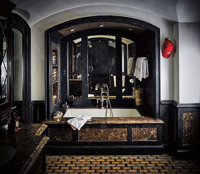 욕실은 엠페라도 (Emperador), 노체(Noce) 사의 트래버틴 타일을 사용했지만 욕조 주변은 네로 마르퀴나(Nero Marquina), 시에나 마블(Siena Marble)을, 멋진 바닥 모자이크는 앤 삭스(Ann Sacks) 타일을 활용해 조각했다. 레프로이 브룩스(Lefroy Brooks)의 수전과 사슴 뿔을 상징으로 한 타월은 레온티네 리넨(Leontine Linens)에서 주문 제작했다.