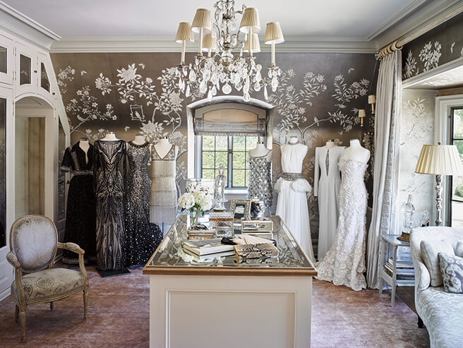 핸드페인팅된 그레이시 (Gracie) 벽지로 장식한 드레스 룸은 매우 디 힐피거다운 공간이다. 역시 수작업으로 완성된 사타론(J.D. Sataron)의 실크 러그 위엔 유리 진열장이 매치돼 있다. 세월이 지나도 여전히 아름다운 디자이너 드레스들은 마네킹에 전시돼 있으며, 컬렉션이 추가될 때마다 주기적으로 교체된다.