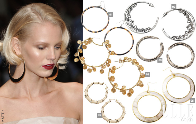 HOOF EARRING 1 레오퍼드 프린트를 입은 후프 이어링, 10만원대, 아가타. 2 독특한 문양의 반달 후프 이어링, 2만5천원, 에바폴린. 3 위빙 패턴의 실버 후프 이어링, 가격 미정, 프라이빗 아이콘. 4 구슬이 알알이 엮인 후프 이어링, 1만원대, 갤러리 반. 5 골드 프레임의 자개 후프 이어링, 1만2천원, H&M. 6 마디로 엮인 크림 컬러 후프 이어링, 4만8천원, 프라이빗 아이콘.