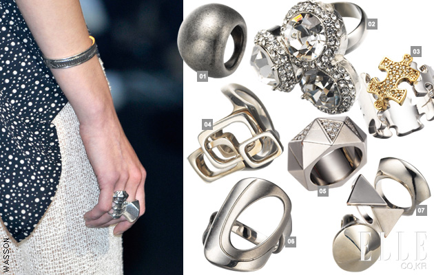 STERLING SILVER RING 1 존재감 있는 볼드한 실버 링, 9천8백원, 스튜디오 아파트먼트. 2 세잎 클로버 모티프의 주얼 스톤 반지, 5만8천원, 클럽 모나코. 3 퍼즐 모양이 재미있는 반지, 가격 미정, 강코 주얼리. 4 직사각형 패턴의 다양한 변신, 20만원대, 꼴레트 말루프. 5 반짝이는 스와로브스키 스톤이 세팅된 커팅 반지, 9만원, ck주얼리. 6 동그랗게 뚫린 모양이 음료수 캔 뚜껑을 상상하게 한다. 가격 미정, 아가타. 7 다양한 모양의 반지를 레이어드해 연출해 보는 건 어떨까? 1만6천원, H&M.