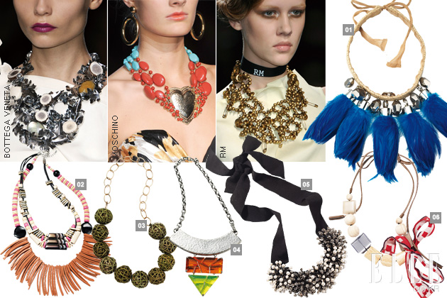 GIANT BIB NECKLACE 1 미지의 부족을 상상하게 만드는 화려한 블루 컬러 네크리스, 가격 미정, 토리 버치. 2 에스닉한 무드의 프린지 네크리스, 10만9천원, H&M. 3 노끈을 감은 듯한 모양의 네크리스, 가격 미정, 피아자 셈피오네. 4 실버와 네온 컬러의 시원한 조화, 가격 미정, 보테가 베네타. 5 솔방울을 엮은 듯 앙증맞은 모양이 인상적이다. 가격 미정, 랑방 컬렉션. 6 사탕 목걸이처럼 달콤한 느낌의 우드 목걸이, 가격 미정, 마르니.