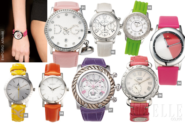 COLOR BAND WATCH 1 하트 참이 달린 사랑스러운 핑크빛 시계, 34만2천원, D&G. 2 세 개의 크로노테크가 멋스럽다. 가격 미정, 블랑팡. 3 싱그러운 그린 컬러로 포인트를 주자. 37만원, 폴리폴리. 4 러버 밴드의 시원한 소재감이 좋다. 21만2천원, 눈 코펜하겐 by 갤러리 어클락. 5 봄을 알리는 개나리꽃 컬러 시계, 15만8천원, 빈폴. 6 매끈한 가죽 밴드가 돋보이는 오렌지 컬러 시계, 29만원, DKNY by 포실코리아. 7 라일락 향기를 닮은 연보랏빛 시계, 2백만원대, 글램 락 by 오콜로지움. 8 베젤의 스티치 디테일이 고급스러운 핑크 컬러 시계, 가격 미정, 펜디 워치.