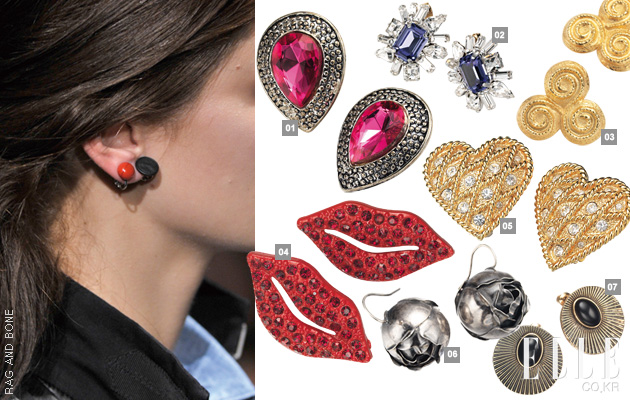 CLIP-ON EARRING 1 물방울 모양의 자수정과 빈티지의 조화. 가격 미정, 더 지크. 2 블루와 화이트의 주얼 장식 이어링, 가격 미정, 오르시아. 3 클로버 모티프의 골드 이어링, 가격 미정, 리사코 주얼리. 4 매혹적인 입술 모양 이어링, 6천8백원, 포에버21. 5 그물 패턴의 통통한 하트 모양의 이어링, 5만원, 프라이빗 아이콘. 6 동그랗게 봉오리가 진 꽃 모양 이어링, 가격 미정, 보테가 베네타. 7 블랙 스톤 장식의 빈티지 이어링, 2만원, 에바폴린.
