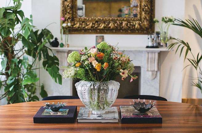 여성스럽고 빈티지한 무드를 살린 거실. 그녀의 시그너처 아이템과도 같은 잔드라 로즈의 빈티지 드레스. 야심한 밤, 홀로 즐기는 황홀한 칵테일 타임은 언제나 소중하다.