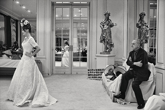 피에르 베르제가 드레스를 피팅 중인 모델을 진지하게 바라보고 있다(1999년).