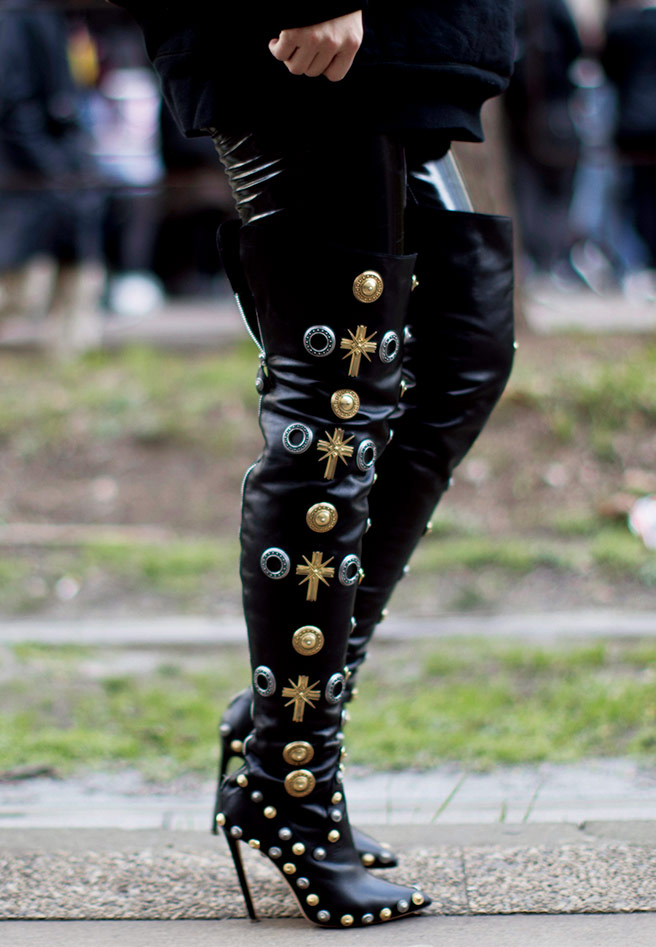 골드 컬러의 앤티크한 장식과 스터드, 아일렛 펀칭으로 이뤄진 사이하이 부츠를 보고 있자니 하나의 예술품을 보는 것 같다.