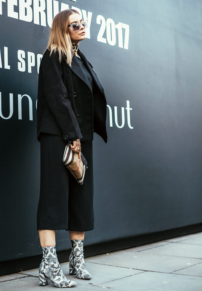 올 블랙 룩에 섹시한 파이톤 소재의 앵클부츠를 매치한 패셔너블한 런더너의 센스.