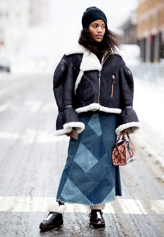 이토록 스타일리시한 방한 룩이 또 있을까! 투박하지만 스타일리시한 무통 코트와 양털 트리밍의 부츠가 인상적이다.