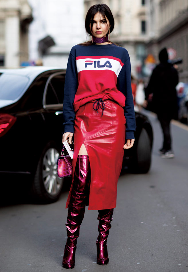 스포티한 스웨트셔츠와 자줏빛 사이하이 부츠로 ‘쿨’한 스트리트 룩을 완성했다.