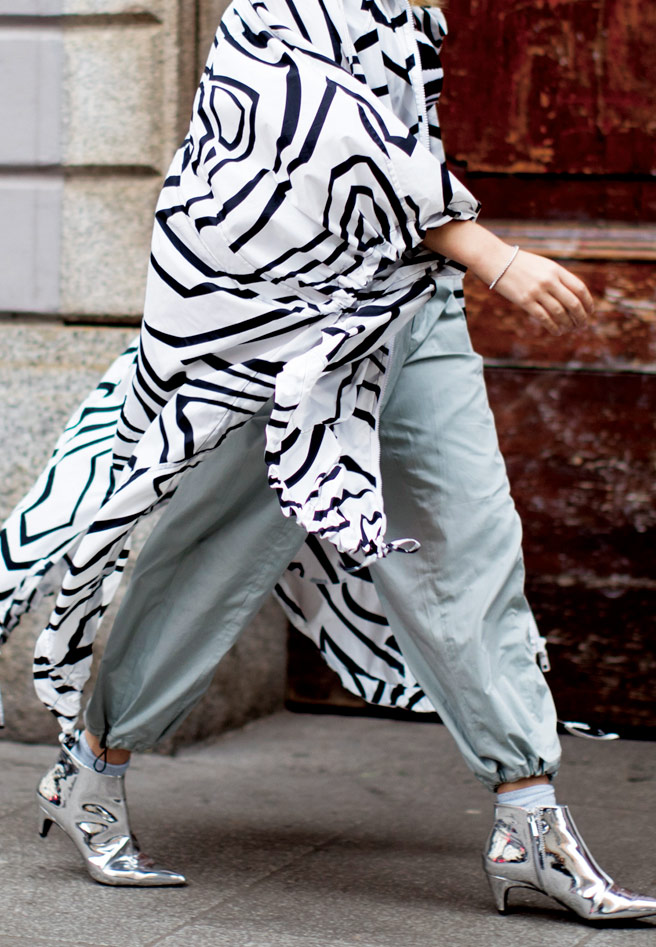 후디드 아노락과 와이드한 하렘 팬츠에 매치한 메탈릭 실버 앵클부츠의 조화가 미래 전사 같은 이미지를 뿜어낸다.