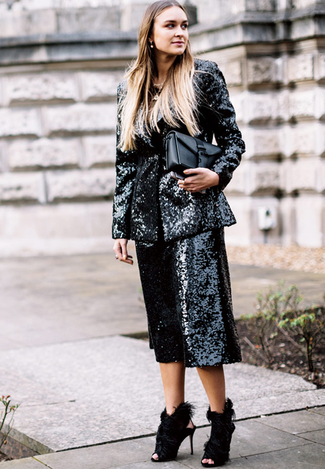 글리터 소재의 스커트 수트와 페더 장식의 오픈 토 부티가 우아한 글램 룩을 완성한다.