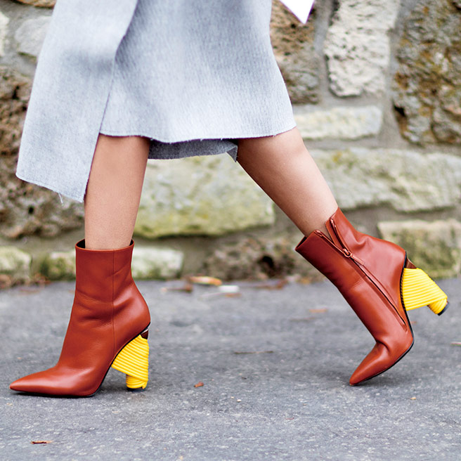 뒤태까지 아름다운 그녀의 옐로 포인트 앵클부츠. 미니멀한 스타일에 세련된 터치를 가미했다.