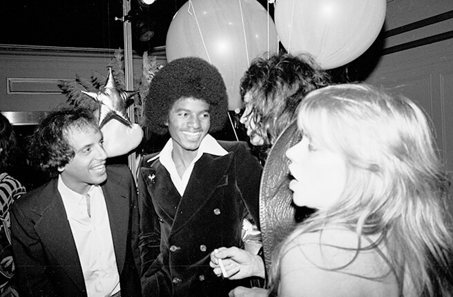록 밴드 에어로스미스의 리더 스티븐 타일러, 런어웨이즈의 멤버 체리 커리와 파티에서 담소를 나누는 마이클 잭슨. 아프로 헤어를 한 마이클 잭슨의 해맑은 미소가 주위를 환하게 만든다. 70년대 보이 밴드 잭슨 파이브의 메인 보컬로 시작해 팝의 황제로 등극한 마이클 잭슨. 노래와 춤, 무대가 완벽히 조화를 이룬 그는 ‘들어왔던’ 노래를 시각적인 드라마(공연 예술)로 완성한 일종의 비주얼 아티스트였다. 다양한 연령대에 어필하며 팝 문화를 넘어 대중문화를 리드하던 그였지만 판타지를 선망하고 어린아이를 좋아하는 피터팬 같은 성향을 지니고 있었다. 가끔 주말 밤, 비즈니스를 위해 파티에 참석하더라도 이내 열정적으로 춤추곤 했던 그의 모습처럼 말이다.