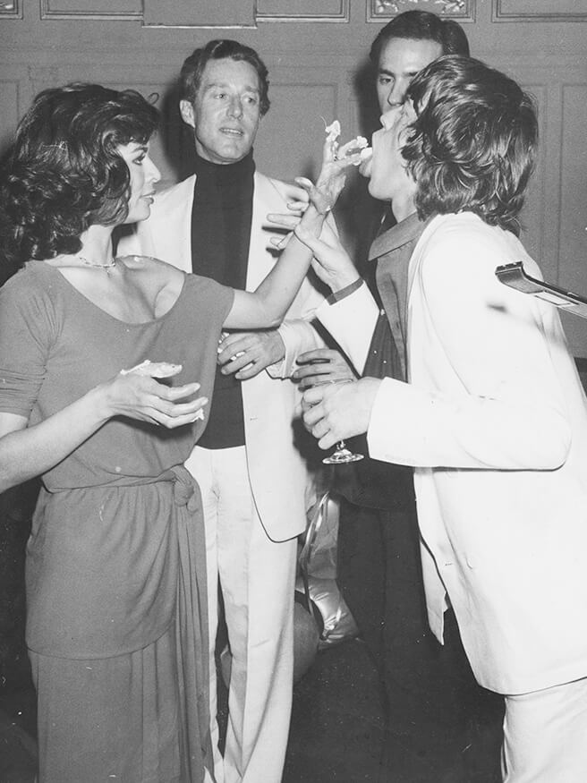 비앙카 재거가 자신의 생일 파티에서 남편 믹 재거에게 케이크를 먹여주며 달달한 풍경을 연출하고 있다. 우주 최강, 여성 편력을 자랑하는 롤링 스톤스의 메인 보컬 믹 재거는 롤링 스톤스 공연 애프터 파티에서 운명처럼 비앙카를 만나 7개월 만에 결혼에 골인했다. 비앙카 재거는 할스턴과 이브 생 로랑의 친한 친구이자 앤디 워홀의 뮤즈 등 무수한 수식어를 달고 다녔던 70년대의 패션 아이콘이다. 결혼식 당시 임신 4개월이었던 비앙카가 입은 팬츠 수트(이브 생 로랑이 디자인한 테일러드 재킷과 롱스커트의 웨딩 수트)는 지금까지 회자될 정도로 그녀의 시그너처 룩이 됐다. 믹 재거의 여성 편력으로 둘의 관계는 오래지 않아 파국을 맞았지만, 글램 록을 대변하던 믹 재거와 중성적 이미지를 보여준 비앙카의 패션 궁합만큼은 길이 남아 있다.