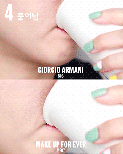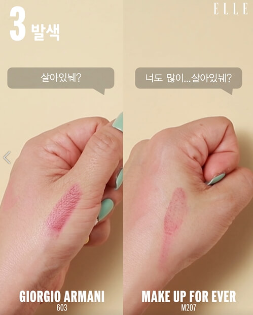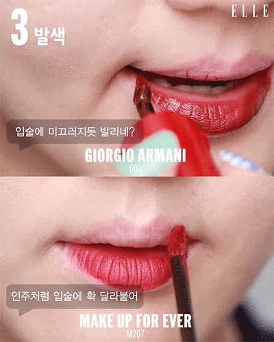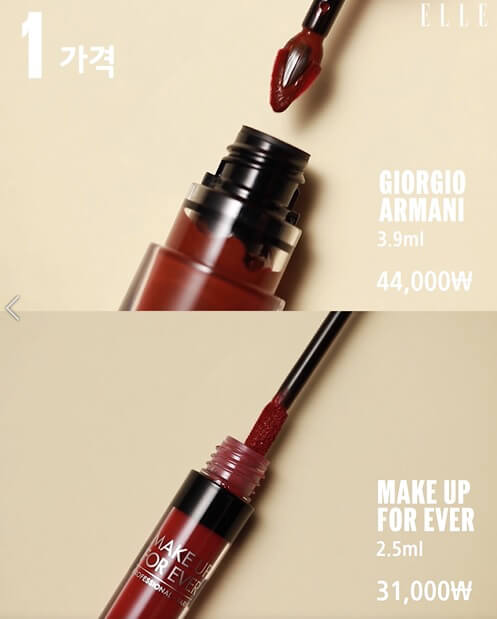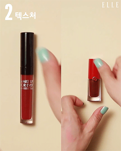 조르지오 아르마니 ‘립 마그넷 리퀴드 타투’는 매트하지만 촉촉함이 느껴지는 제형이고, 메이크업 포에버 ‘아티스트 리퀴드’는 명백한 매트한 텍스처!