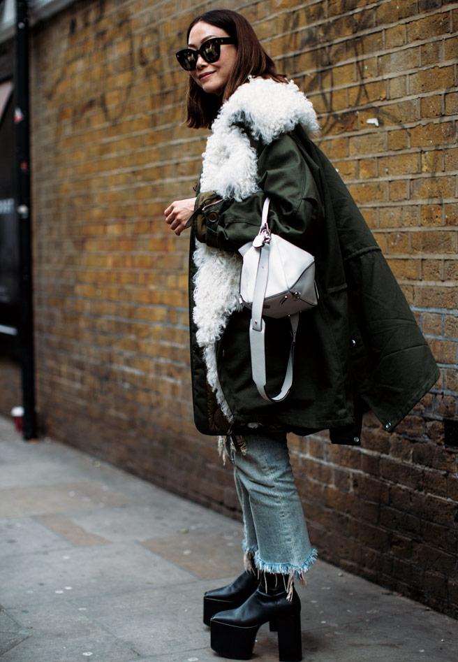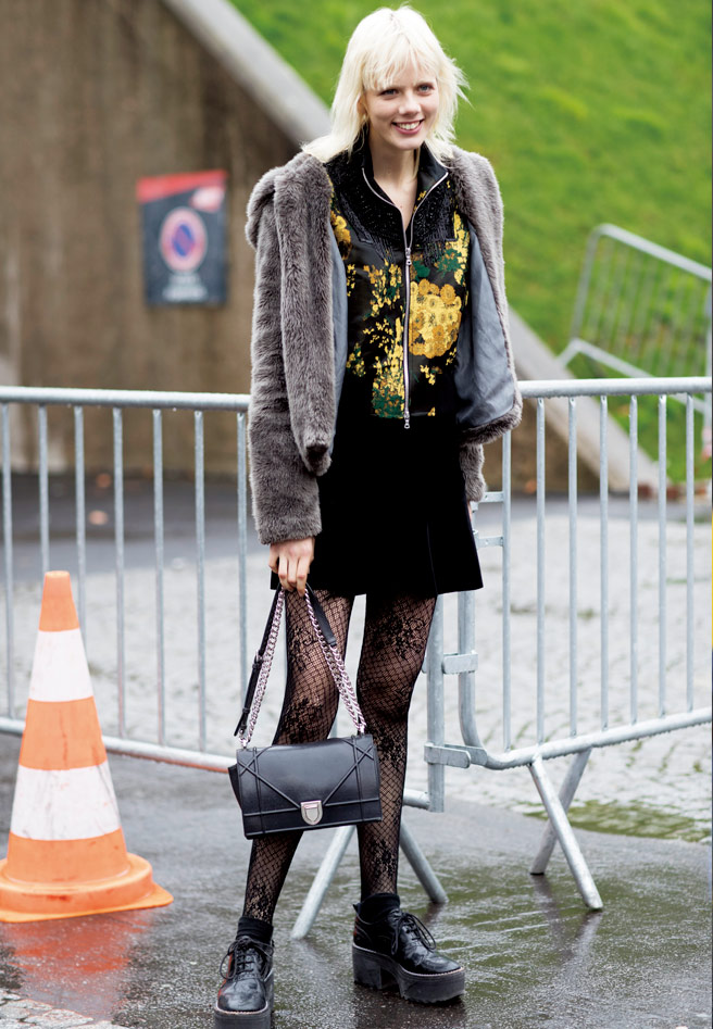견고하고 둔탁한 워크 부츠와 핸드메이드 스티치가 돋보이는 백으로 스타일링에 포인트를 준 그녀는 위태롭고 거친 느낌을 짙게 풍긴다.