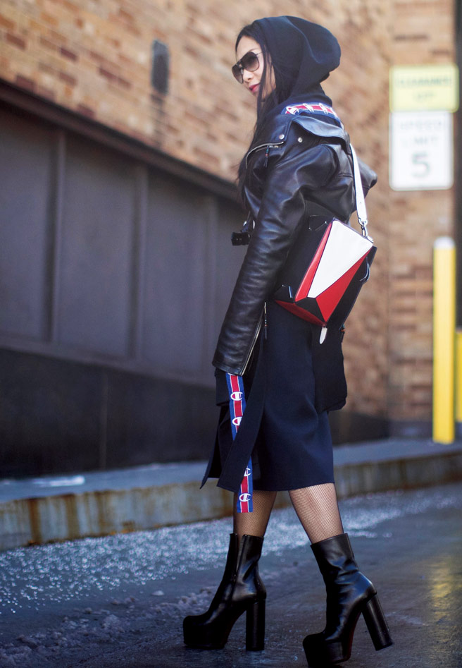 스포티한 스커트에 미니멀 라인이 돋보이는 백팩. 세련된 보잉 선글라스에 파워플한 슈즈를 매치하는 식으로 강렬한 스타일링 대비를 선보인 패션 피플.