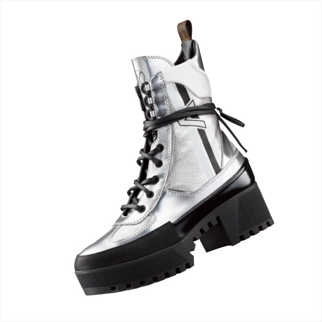 메탈릭한 보디에 질끈 동여맨 신발끈으로 강력한 힘이 느껴지는 워크 부츠는 가격 미정, Louis Vuitton.
