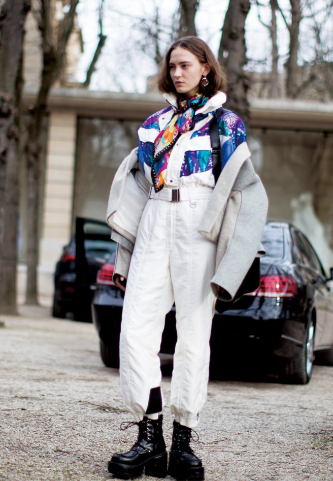 우주복을 연상시키는 그녀의 스타일을 그냥 지나칠 수 있는 사진가가 있을까? 페미닌한 스카프에 큼지막한 워크 부츠를 믹스매치한 센스가 인상적!