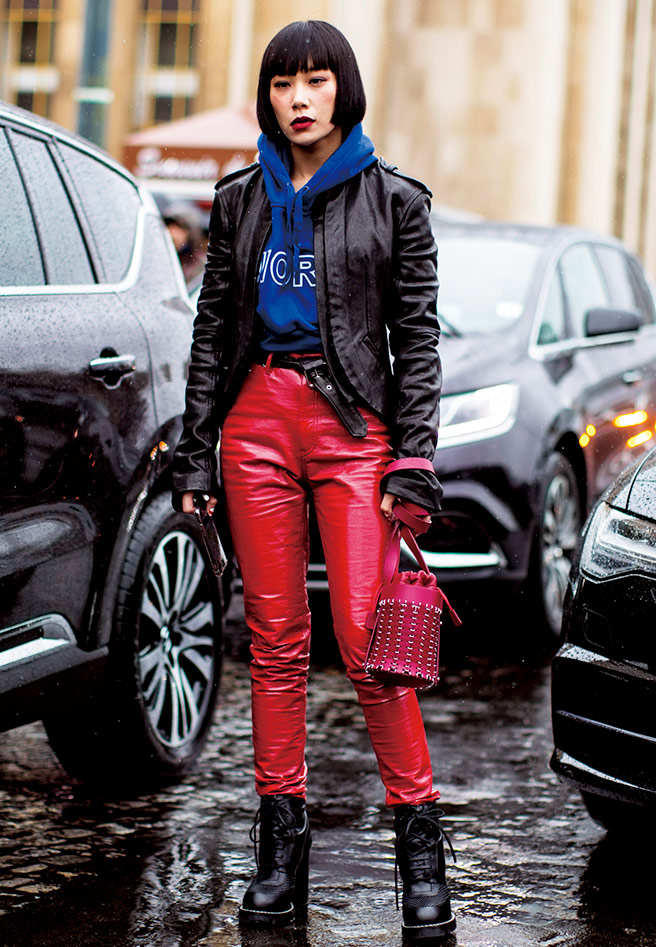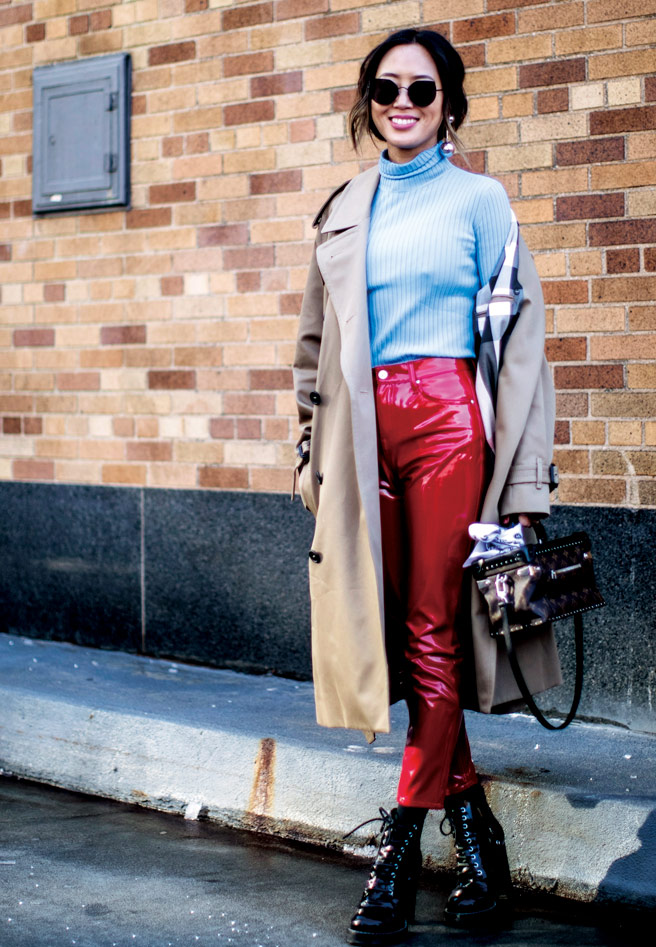 트렌치코트는 보수적이라는 고정관념을 버릴 것. 레드 레더 팬츠와 타이트하게 떨어지는 실루엣의 워크 부츠로 창의적인 스타일을 완성했다.