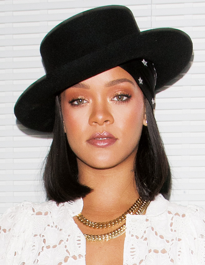 90년대 갱스터 힙합의 재현? 리한나는 챙 넓은 모자와 별 모양 패턴의 두건, 체인 네크리스로 그때 그 시절의 느낌을 살렸다. 헤어엔 인컬만 살짝 넣고, 누드 립 컬러로 과한 느낌을 중화한 노련함을 캐치할 것.