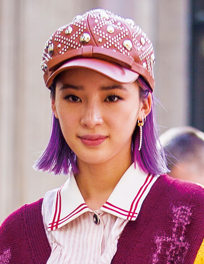마치 유니콘 같은 모습의 아이린. 일반인은 엄두도 못 낼 꽃분홍 빵모자와 퍼플 헤어, 딥한 바이올렛 재킷까지. 조화를 이루는 그녀의 톤 온 톤 컬러 매치 센스.