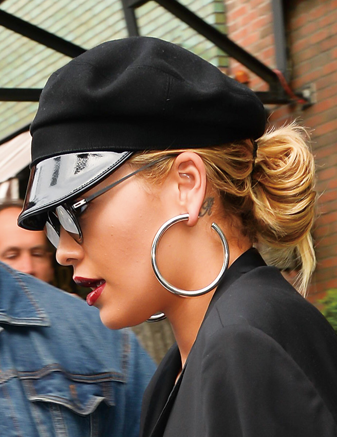 포멀한 수트로 연출하는 스트리트 무드. 리타 오라처럼 커다란 링 귀고리에 푹 눌러쓴 모자 그리고 몇 가닥 삐져 나오도록 루스하게 묶은 당고 머리면 끝.