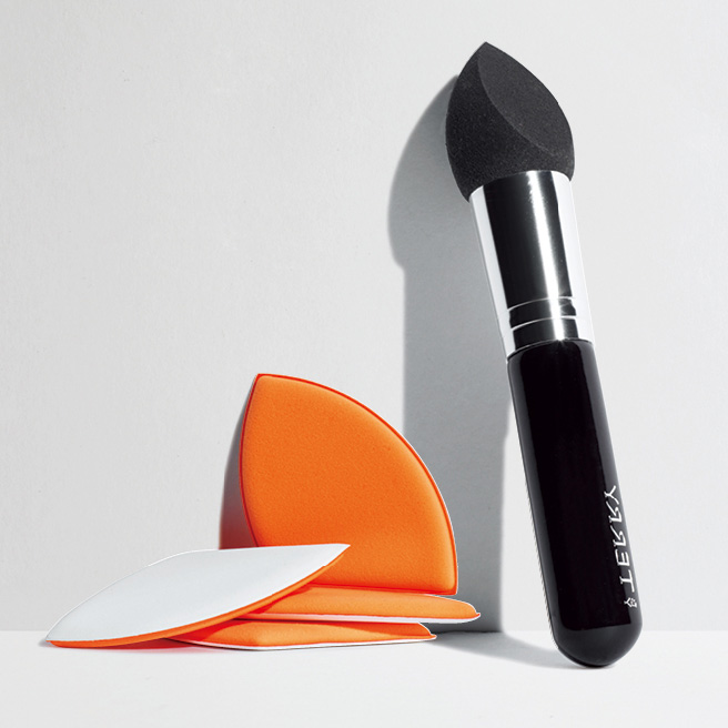 손에 묻는 게 싫었다면 강추. 손잡이가 달린 타원형 포인트 스펀지 브러시는 윤곽 컨투어링에 최적화돼 있다. 평평한 면으로 콧대 옆, 턱 등 셰이딩 부위를 발라준 다음 블렌딩한다.
