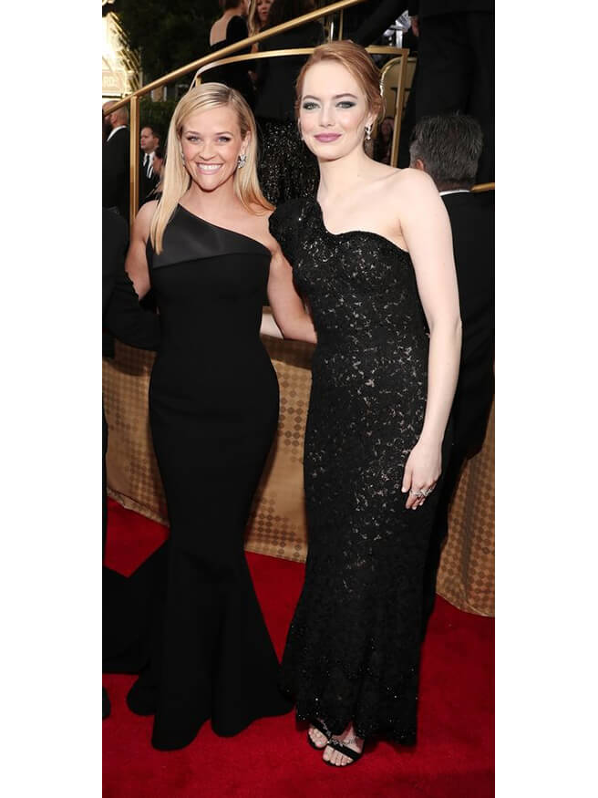 머메이드 실루엣의 원 오프숄더 블랙 드레스를 사이좋게 입은 리즈 위더스푼과 엠마 스톤.