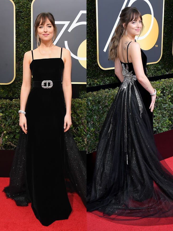 드레스에 은하수가 달렸나? 반전 뒤태를 자랑하는 구찌의 블랙 드레스를 자연스럽게 소화한 다코타 존슨.